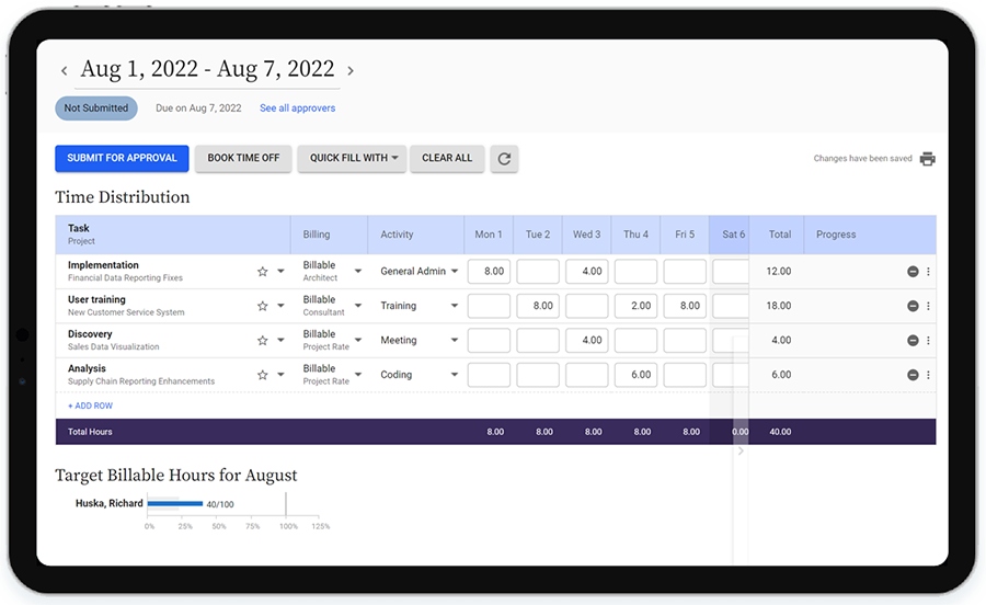 Manage performance and accountability with access to historical trends and real-time billable target progress.